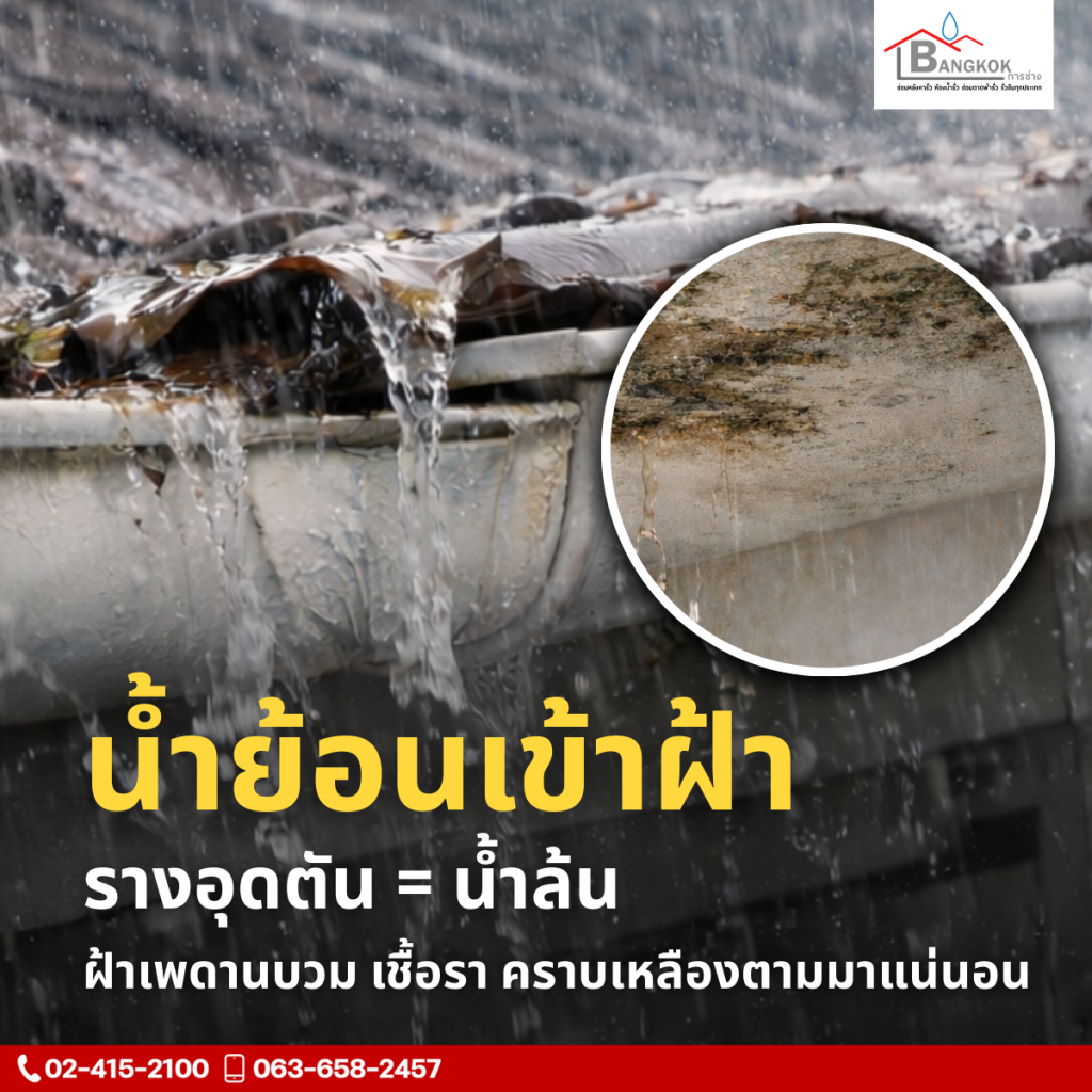 🔹 น้ำย้อนเข้าฝ้า รางอุดตัน = น้ำล้น ฝ้าเพดานบวม เชื้อรา คราบเหลืองตามมาแน่นอน