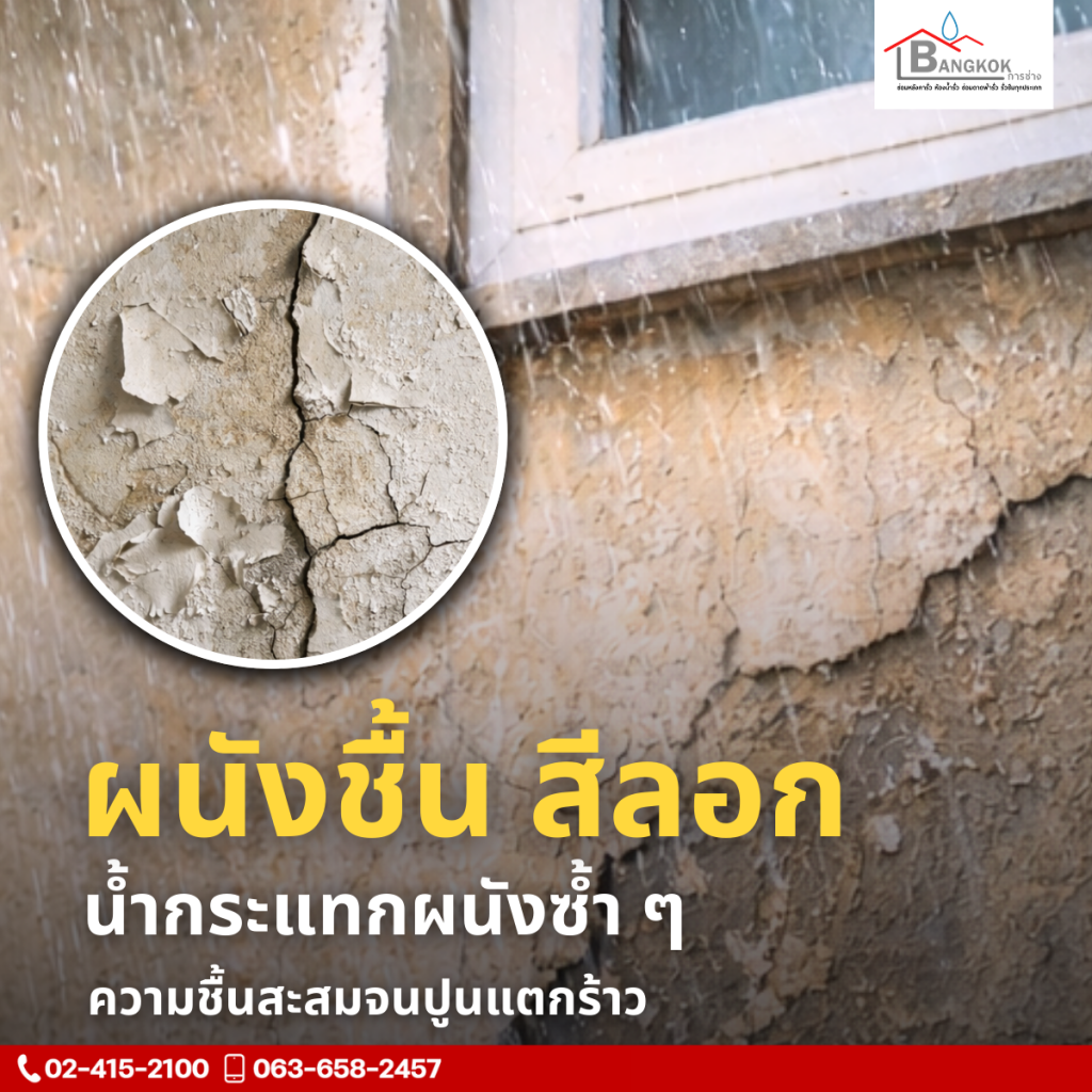 🔹 ผนังชื้น สีลอก น้ำกระแทกผนังซ้ำ ๆ ความชื้นสะสมจนปูนแตกร้าว