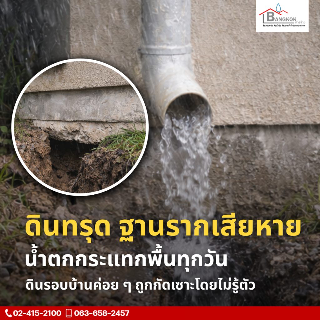 🔹 ดินทรุด ฐานรากเสียหาย น้ำตกกระแทกพื้นทุกวัน ดินรอบบ้านค่อย ๆ ถูกกัดเซาะโดยไม่รู้ตัว