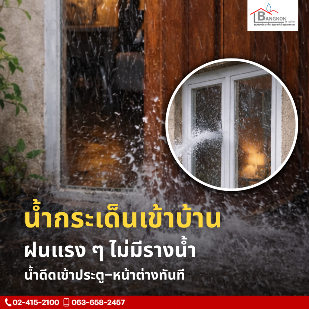 🔹 น้ำกระเด็นเข้าบ้าน ฝนแรง ๆ ไม่มีรางน้ำ น้ำดีดเข้าประตู–หน้าต่างทันที
