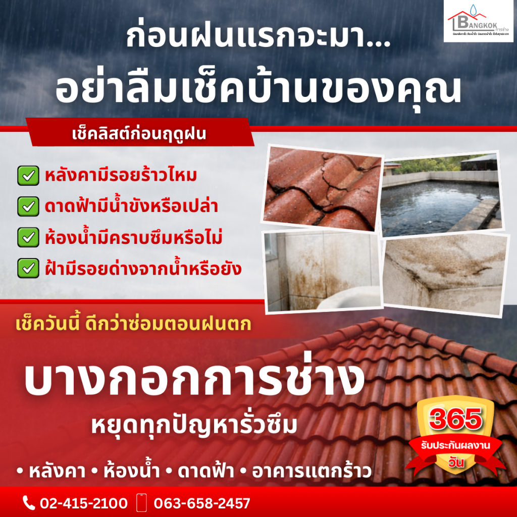 ก่อนฝนแรกจะมา…เช็คบ้านก่อนดีไหม? Posted on April 6, 2026 by bkkkc Leave a Comment on ก่อนฝนแรกจะมา…เช็คบ้านก่อนดีไหม? เช็ควันนี้ ดีกว่าซ่อมตอนฝนตก บางกอกการช่าง หยุดทุกปัญหารั่วซึม